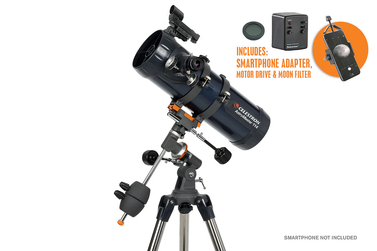Introducing the Celestron AstroMaster 114EQ with Motor Drive and Phone Adapter, a versatile Newtonian reflector telescope designed to provide clear and detailed views of celestial objects. This telescope is ideal for both beginners and experienced astronomers, offering a combination of quality optics and user-friendly features.