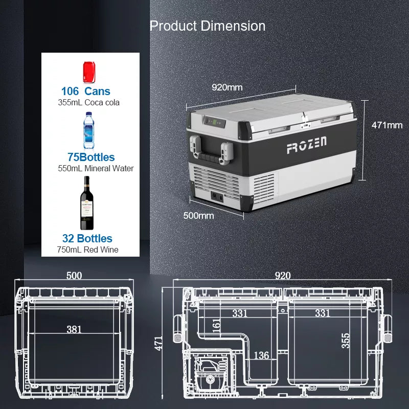 Introducing the Frozen FC95 Double Door Fridge/Freezer - 95L. This high-capacity, dual-zone portable fridge freezer is engineered for adventurers who demand reliability and performance. With a robust 95-litre capacity split between two independently controlled compartments, it offers versatile cooling and freezing options for extended trips. The unit features a high-quality compressor, ensuring rapid cooling down to -22°C, and operates efficiently on both 12/24V DC and 100-240V AC power sources. Its rugged design, complete with anti-shaking technology, makes it ideal for off-road and outdoor use. Whether you're camping, boating, or on a road trip, the FC95 keeps your provisions fresh and your beverages chilled.