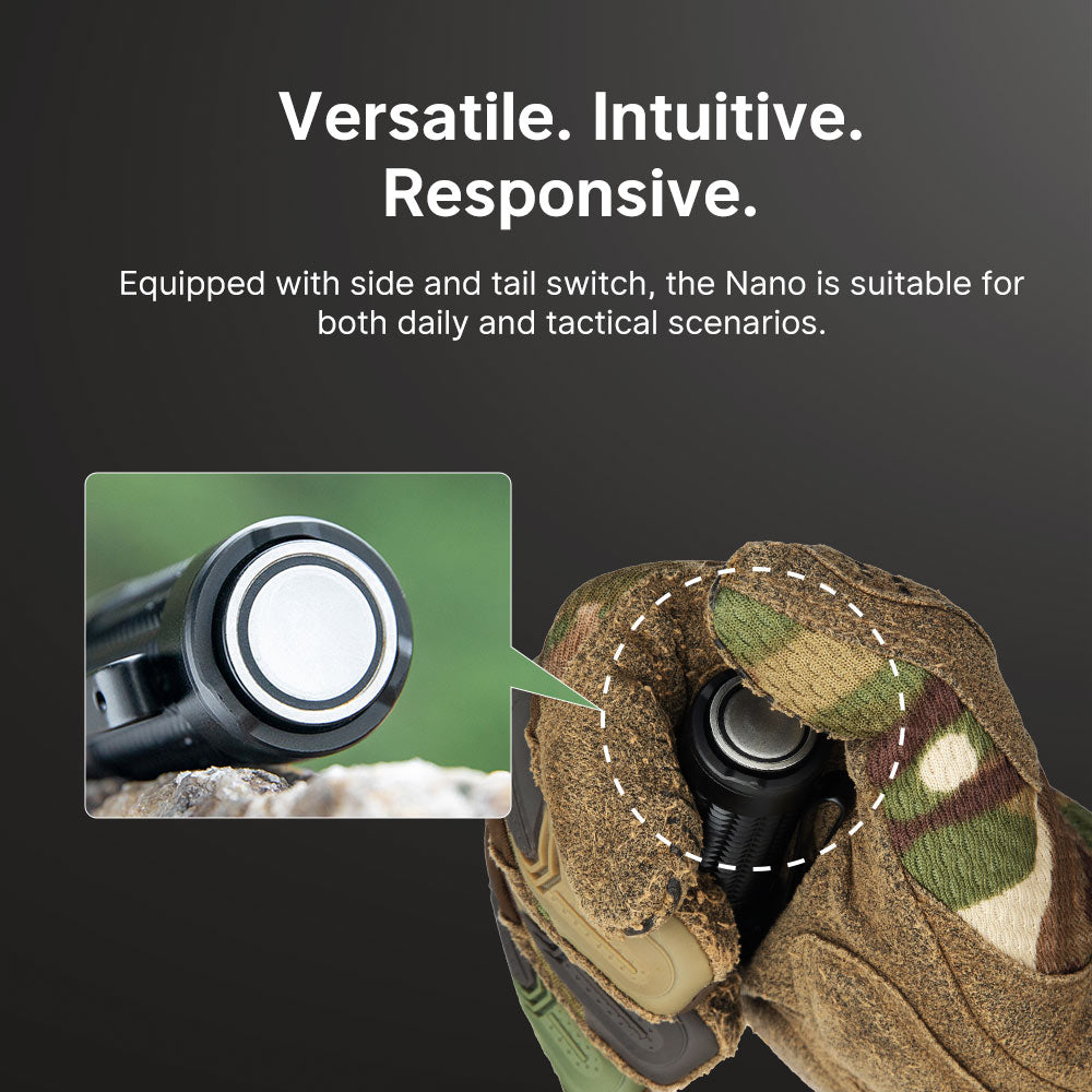 Setting up the Olight Warrior Nano is incredibly user-friendly, thanks to its dual switch design. The flashlight features both a side switch and a larger, seamless tail switch, allowing you to choose the best activation method for your needs. Whether you prefer a soft tap for everyday use or a heavier press for tactical scenarios, the Warrior Nano provides precise feedback to ensure you get the performance you expect from a top-tier flashlight.