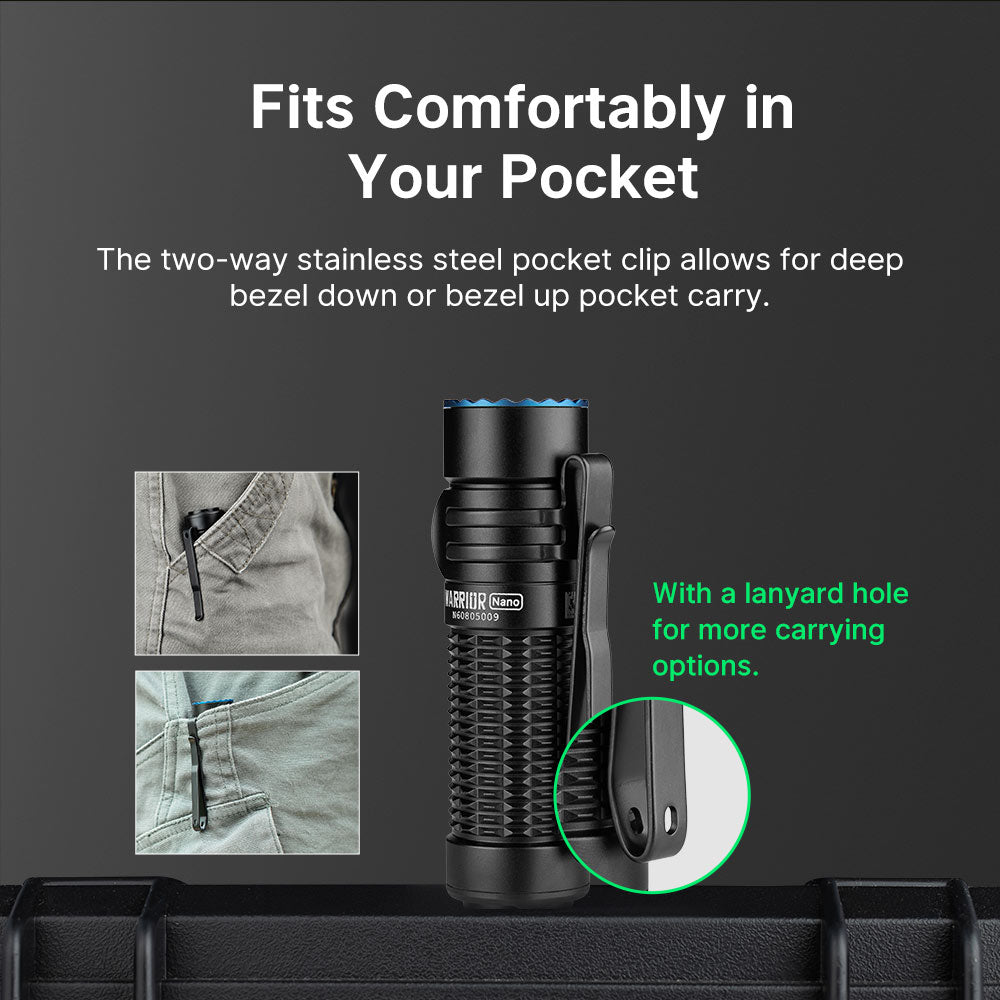 Weighing in at just 90 grams (3.19 oz) and measuring 8.1 cm (3.19 inches) in length, the Warrior Nano is remarkably portable. It can easily fit in your pocket, bag, or be clipped onto your belt for convenient access. The dual-way stainless steel clip offers flexibility in how you carry it—whether you prefer a bezel-up or bezel-down position, this flashlight adapts to your lifestyle.